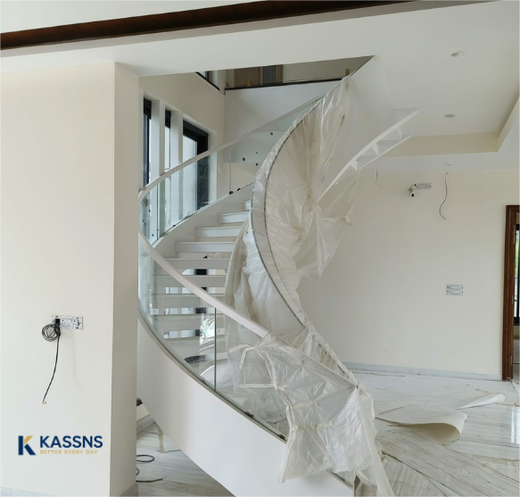 This NRI residence was executed on a complete turnkey basis, where our team handled the full construction and finishing scope. A key highlight of the home is the custom curved staircase in the double-height foyer, which required precise structural execution, shuttering, and detailing due to its complex geometry and integration with glass railings. Executing this staircase was one of the major construction challenges, but the final result creates a striking architectural centrepiece within the home.